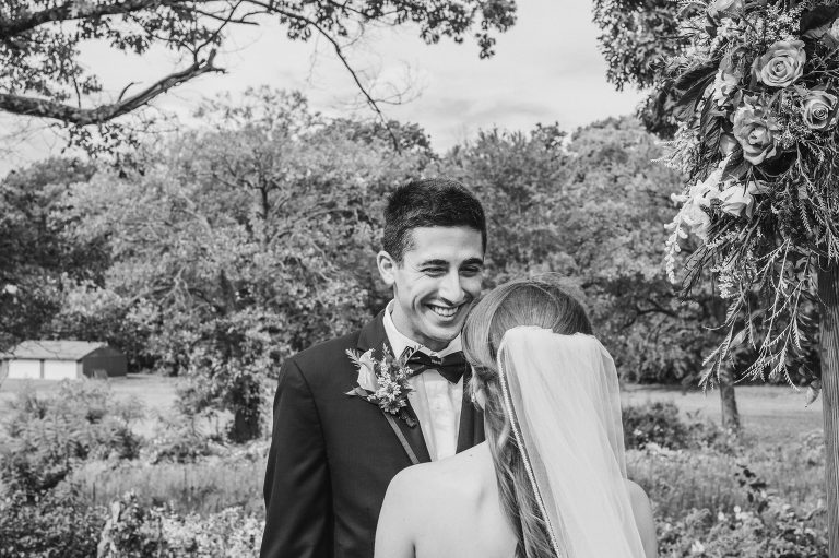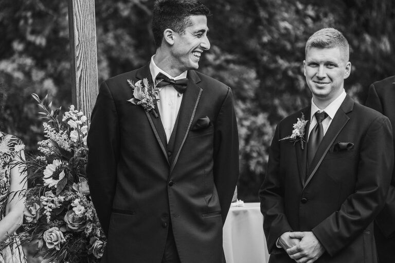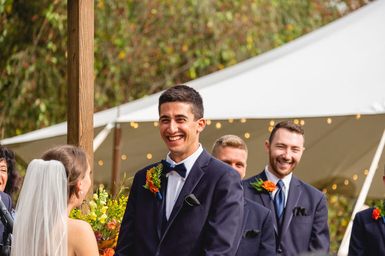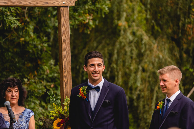 Eric waited outside by the ceremony archway to catch his first glimpse of Rachel as she walked around the corner to the ceremony in the backyard. This is my favorite way to do a first look; a casual and natural moment of pure joy.