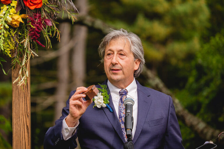 The ceremony began with a very special “ring warming” ceremony. Dan announced that the box with the wedding bands would be passed around to each person at the ceremony. Each guest was to hold the ring box and warm it with positive thoughts and prayers for the happy couple.